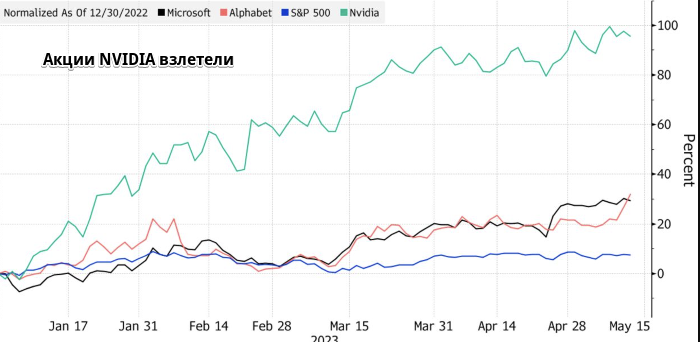 В этом году фондовые рынки растут только благодаря искуcственному интеллекту По мнению стратега Societe Generale SA Маниша Кабра, инвестиционный ажиотаж вокруг технологий искусственного интеллекта поможет фондовому рынку остаться в зеленой зоне в 2023 году. Инвесторы, неожиданно полюбившие все, что связано с искусcтвенным интеллектом, взвинтили акции компании Nvidia. Компания, которая производит чипы, необходимые для сложных вычислительных задач, с начала года подорожала на 96%. Ценные бумаги Microsoft Corp. и Alphabet Inc тоже греются в лучах славы, поскольку эти технологические гиганты активно добавляют функционал ИИ в свои продукты и услуги. Акции этих трех компаний больше всего способствовали росту S&P 500 на 7.6% в 2023 году. «Хайп вокруг ИИ по-прежнему силен», — написал в пятницу в своей заметке Кабра. «Он настолько сильный, что без популярных акций, связанных с ИИ, S&P 500 упал бы на 2% в этом году». Чтобы торговать на хайпе вокруг ИИ, инвесторы должны владеть защитными растущим