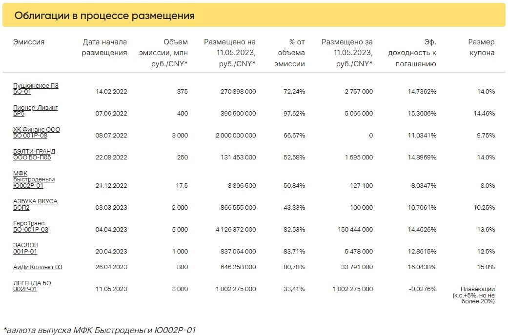 11 мая стартовало размещение «зеленого» выпуска ЛЕГЕНДА БО 002Р-01 . В первый день торгов был размещен 1 млрд 2 млн 275 тыс. рублей за 50 сделок (33,41% от объема эмиссии). Суммарный объем торгов в основном режиме по 284 выпускам составил 670,9 млн рублей, средневзвешенная доходность — 12,44%. 📊 Подробнее в ВДОграфе Больше актуальных новостей читайте оперативно в нашем телеграм-канале