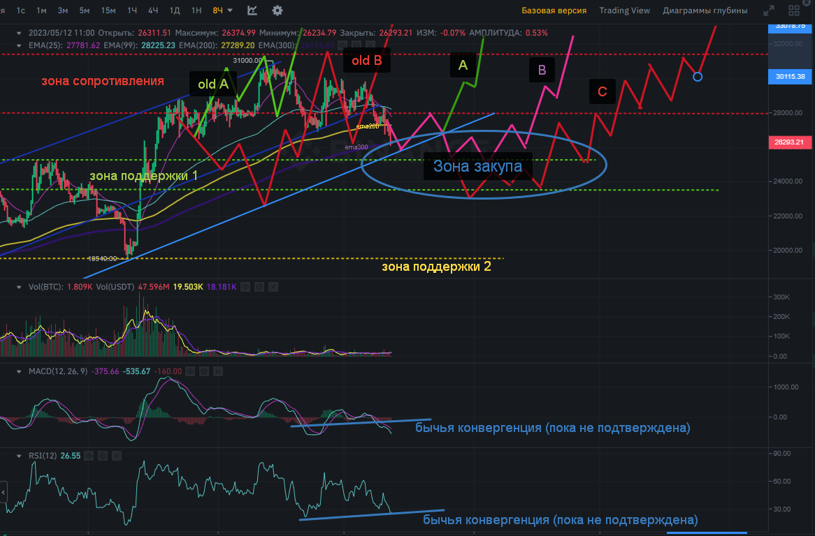 Обновил свою табличку по прогнозу курса. Конечно мне уже говорили, о том, что как-так, вариант А, вариант Б, скажи единственно верный. А единственно верного, его не существует, потому, что биток и манимэйкеры очень хитро водят курс всех за нос, чтобы не один из прогнозов не сбылся, чтобы брить и тех и других. Именно поэтому я пытаюсь прогнозировать с разной степенью вероятности. И кстати предыдущие прогнозы на 80% сбылись, с той лишь оговоркой, что биток вначале пошёл по варианту А (old A) а потом по варианту Б (old B), но так и не смог пробить линию сопротивления (30000$). Далее я разметил варианты развития событий исходя из текущей ситуации. Исходя из всего вышеописанного зона покупок 23000$-27000$, т.е. уже сейчас, но, чтобы закупаться по самому выгодному курсу берём партиями, на протяжении месяца, двух, если рост ускоряется, ускоряем закуп, вплоть до 1-2 недель. Кстати в вариантах B и C мы дорисуем медвежью фигуру "голова плечи", вариант А, это "бычий флаг". После выхода битка выше