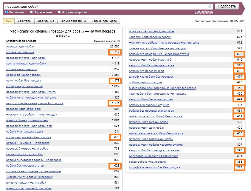 Идея этого поста появилась случайно, когда, проводя исследование рынка, потребовалось уточнить, как часто люди ищут такой товар, как поводок. Какого же было удивление, когда в результатах мы увидели, что наиболее часто люди интересуются именно темой отсутствия поводка на прогулке (скрин ниже).
