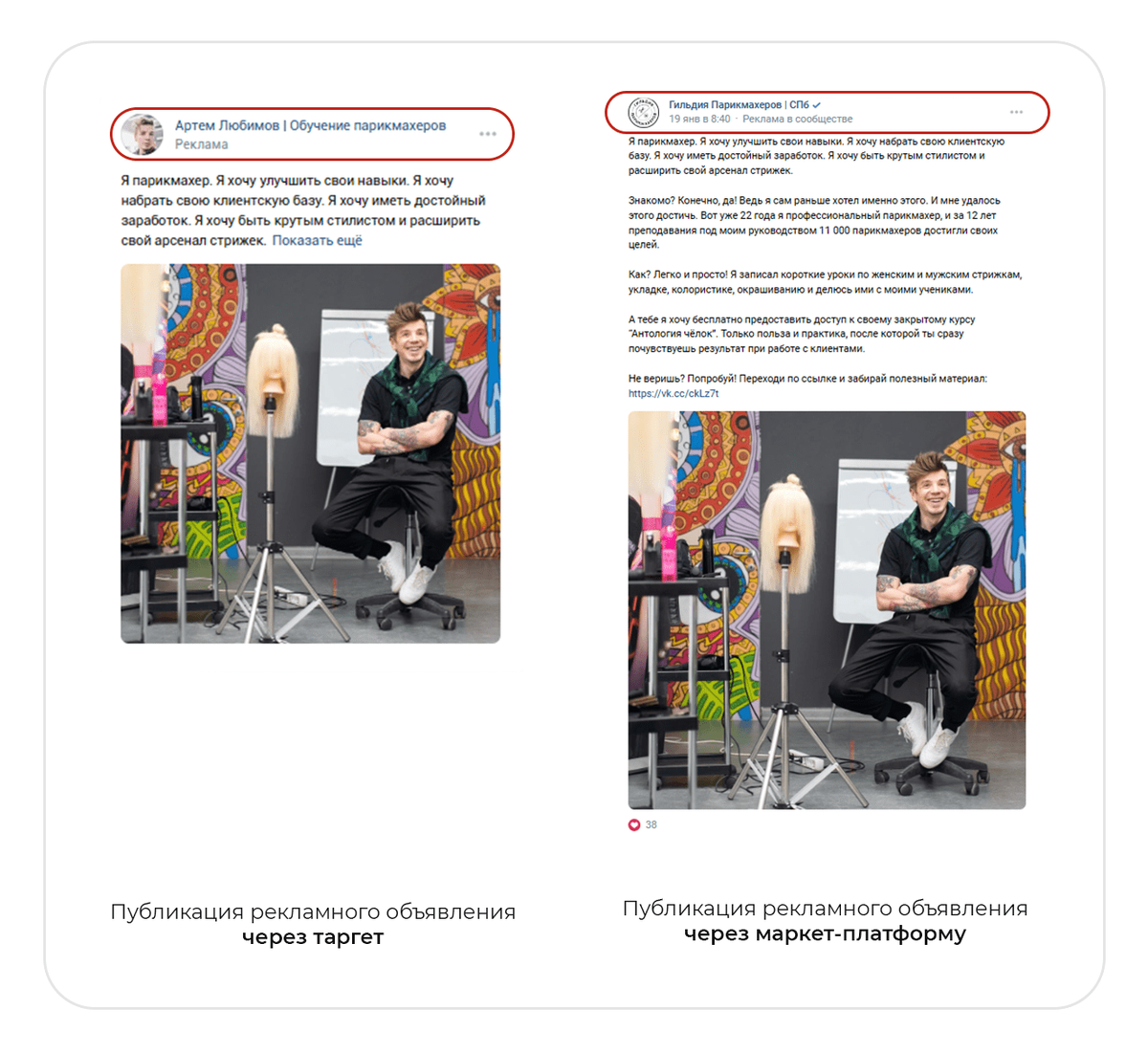 Внешне реклама на маркет-платформе выглядит так же, как и в таргете: пост и вложения, но есть и особенности. Дальше расскажем, какие видим преимущества публикации рекламных объявлений на маркет-платформе перед таргетом.