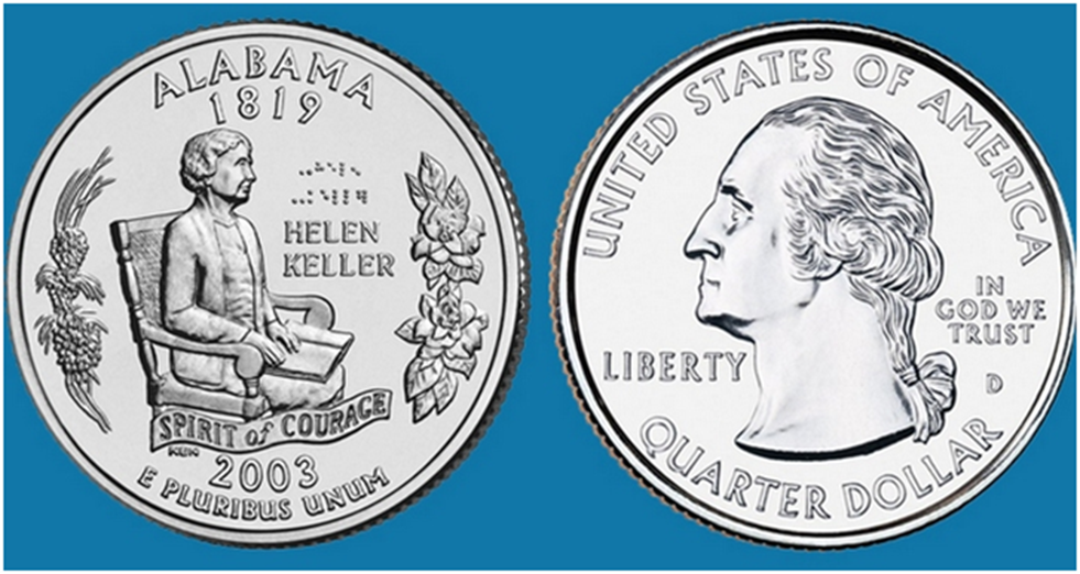 Хелен Адамс Келлер (1880 — 1968) – слепоглухая американская писательница, преподавательница и общественный деятель ,которой первой среди людей с такими физическими проблемами удалось получить степень бакалавра. Изображение Келлер можно найти на юбилейном двадцатипятицентовике штата Алабама(см. выше). В возрасте девятнадцати месяцев Келлер перенесла заболевание (предположительно, скарлатину ) , в результате которого полностью лишилась слуха и зрения. По достижении Хелен семи лет родители подыскали дочери учителя Энн Салливан, которая сумела найти подход к девочке, что стало существенным прорывом в специальной педагогике . Именно Салливан открыла для Элен путь к познанию .Она прожила всю жизнь рядом со своей воспитанницей, считая, что история ее преподавания и есть история ее жизни, а ее работа и есть ее биография. Их связывали узы искренней дружбы, которые с годами становились крепче и крепче. В 1904-м, через год после окончания колледжа, Хелен вступила в Социалистическую партию. Девушк