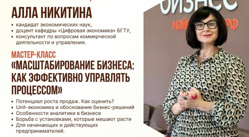 Брянский областной Центр оказания услуг «Мой бизнес» приглашает предпринимателей на мастер-класс «Масштабирование бизнеса: как эффективно управлять процессом». Он запланирован на 31 мая по адресу: улица Бежицкая, 54. Начало — в 11:00. Отмечается, что участие в мероприятии бесплатное, так как это господдержка по национальному проекту «Малое и среднее предпринимательство». Он инициирован президентом Владимиром Путиным. Спикером выступит Алла Никитина. Она кандидат экономических наук, доцент кафедры «Компьютерные технологии и системы» Брянского государственного технического университета, маркетолог-стратег, бизнес-консультант. 12+ Брянских бизнесменов пригласили на бесплатный мастер-класс по масштабированию бизнеса