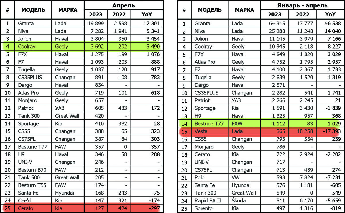 Рейтинг самых продаваемых автомобилей в России в апреле 2023 года