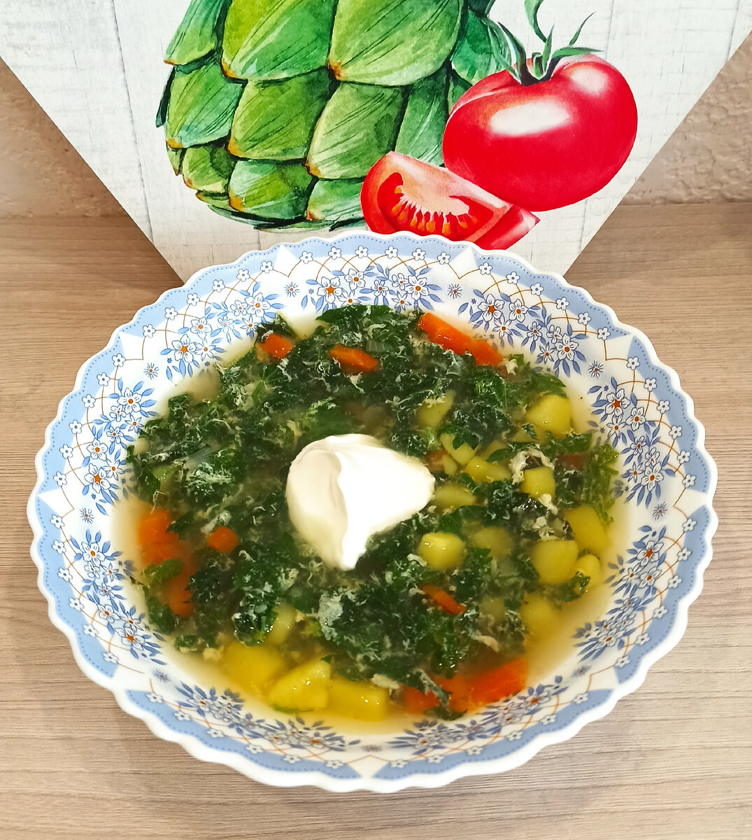 Настоявшейся суп разливаем по тарелкам, добавляем ложку сметаны, а так же можно положить сверху половинки вареного яйца и наслаждаемся вкусным и полезным супом.