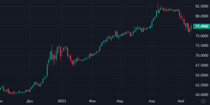 Этому способствуют краткосрочная перекупленность российской валюты, возможная эскалация ситуации в зоне СВО и укрепление доллара по всему рынку. График курса доллара к рублю интервалами 1 день С середины апреля рубль заметно подорожал против доллара, евро и юаня. Этому способствовали как минимум два важных фактора: ожидания улучшения показателей бюджета РФ, а также перспективы увеличения нефтегазовых доходов на фоне дальнейшего сокращения дисконта, с которым российская нефть Urals продается к Brent. Однако в последние две сессии рубль начал корректироваться вниз, поводом для чего послужили противоречивые сообщения в СМИ о начале контрнаступления ВСУ. На этом фоне рубль может закрыть снижением против доллара первую неделю из последних четырех, чему в немалой степени способствует и укрепление доллара по всему рынку. Крупнейшие экспортеры в апреле сократили объем чистых продаж иностранной валюты до $7 млрд с $11,6 млрд в марте (-42% м/м), говорится в «Обзоре рисков финансовых рынков», кот