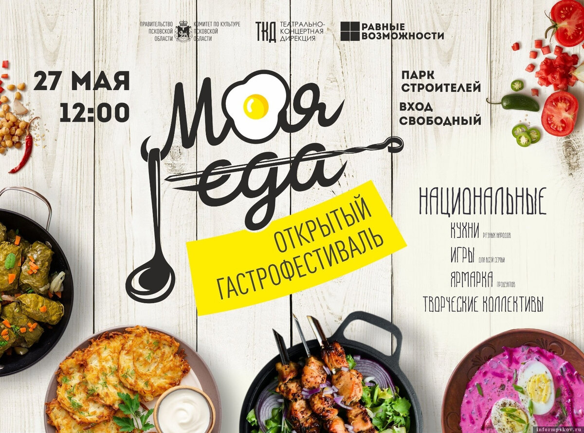 Гастрономический фестиваль «Моя еда» развернётся в парке Строителей в Пскове 27 мая с 12:00 до 18:00. На площадке будет работать ярмарка продовольственных товаров собственного производства по рецептам национальной кухни народов, проживающих в Псковской области.