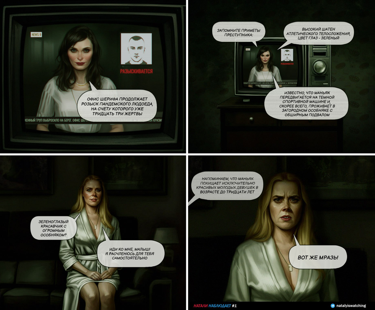 Серия комиксов «Натали наблюдает» - Черный юмор проиллюстрированный с помощью нейросети Stable Diffusion