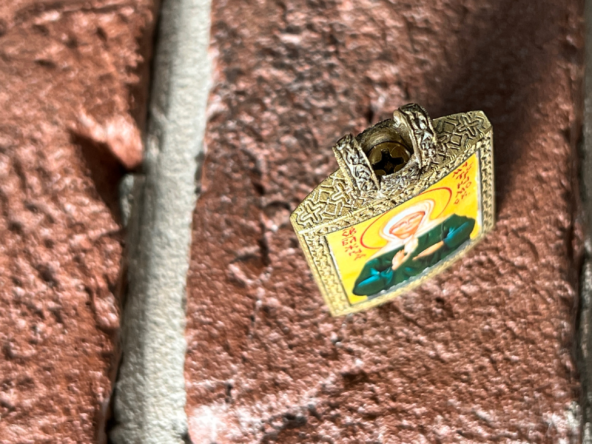 Нательный иконка с латунной мирницей и деревянными вставками. С лицевой стороны рукописный лик Матроны Московской. С тыльной стороны молитва о желаниях.