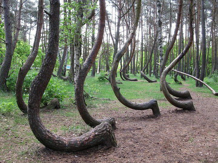 Кривой Лес, расположенный в небольшом городке Грынфо в Польше, удивляет своей уникальностью и необычностью. Здесь правилом является то, что большинство деревьев имеют нестандартно изогнутые стволы. Если обычные леса представляют собой стройные и ровные деревья, то Кривой Лес привлекает внимание своим необычным видом. Этот уникальный лес состоит из деревьев, главным отличием которых являются их диковатые изгибы и кривые стволы. Деревья в Кривом Лесу являются не просто исключением из правил, они здесь представлены большинством и создают вместе невероятную атмосферу. Гуляя по этому лесу, можно ощутить магию и загадочность, которая окружает это удивительное место. На площади более 1,5 гектаров растет около 400 сосен с необычным строением ствола. Больше всего стволы похожи на гигантские деревянные рыболовные крючки или на перевернутые вопросительные знаки. Деревья в Кривом Лесу в Польше имеют странные изгибы и кривые стволы. Они начинают расти прямо к Солнцу, но затем внезапно меняют направ