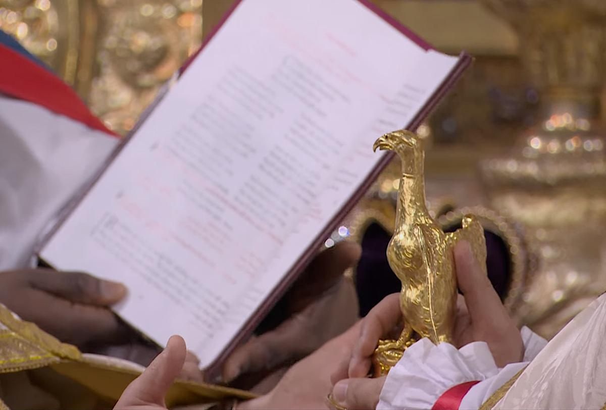 Архиепископ Кентерберийский вылил освященное масло из золотой ампулы в виде орла в ложку для помазания XII века.