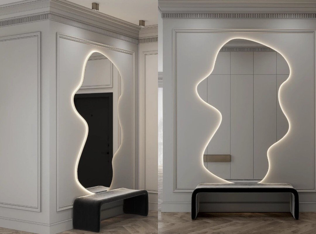 Приветствую вас! В этой статье я поделюсь 7 классными идеями для украшения прихожей и коридора. Узнаете о цветах, освещении, мебели и хранении. Вместе превратим пространство в идеальное приветствие вашего дома. Подготовьтесь к вдохновению! Начнем! Зеркало необычной формы Крупное зеркало преобразит даже маленькое пространство, включая прихожую. Оно имеет округлую форму и элегантно обрамлено прямыми молдингами. Визуально оно гармонично сочетается с изогнутой скамейкой, расположенной под ним. Скамейка не только служит подставкой для зеркала, но и придаёт завершенность интерьеру. Зонировать цветом Цветовое зонирование делает прихожую и коридор более интересными. В данном примере дизайнер использовал насыщенный синий цвет, чтобы выделить зону после коридора, где преобладают светлые нейтральные оттенки. Синий цвет имеет четкую границу вокруг входной двери, а синий плинтус, простирающийся по всему коридору, помогает создать единый стиль и избежать разрозненности интерьера из-за резких переход