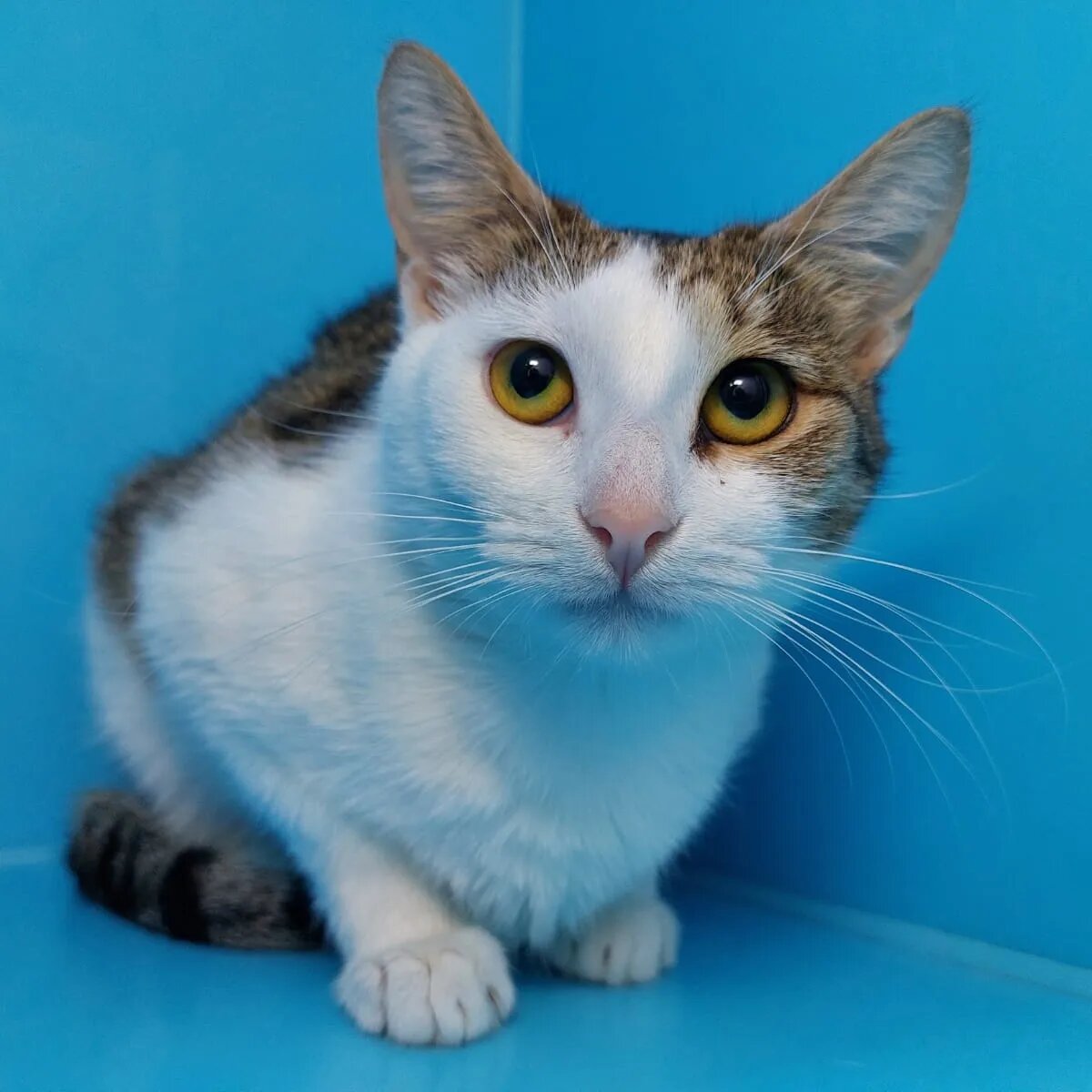 Малютка Мими, молоденькая (меньше года), ласковая, с очень забавной мордашкой. Кошечка невероятно обаятельная! Но так никому и не приглянулась.. Мими "не повезло" быть белой в пятнышко, таких люди забирают очень редко и с неохотой. Почему? - вопрос без ответа, видимо, такой окрас плохо вписывается в интерьер или слишком пестрит в глазах.. Но факт остаётся фактом: беленькие кошечки в шапочках дольше всех остальных ищут дом, какими бы ласковыми, красивыми они ни были Помимо очень выразительной внешности и немного съехавшего коричневого пятнышка на голове Мими - обладательница очень ласкового, мурчащего характера, кошечка ручная и контактная, компанейская. В силу молодого возраста в меру активна и игрива, но, к сожалению, в маленьком боксе ей особо не поиграть, да что уж там, даже люди к ней заходят редко.. Мими очень нужен дом. Нужен человек, который не станет смотреть поверхностно, не отметет ее из кандидатов лишь за то, что не угодила цветом, ведь она его не выбирала.. Мими - предес