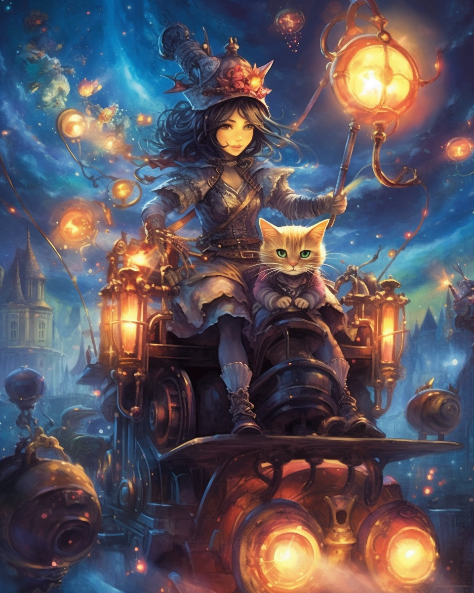 Представьте себе ведьму и её кошу, летающих на своей механической метле. И всё это в стиле стимпанк. На что будет похожа эта метла - думаете на пылесос? О, нет. Смотрите иллюстрации в этой подборке. Сразу предупреждаю, все эти арты сгенерированы нейросетью. Сейчас много скептиков, которые говорят, что нейросеть это не искусство. А коты из нейросети неинтересны и бездушны. Спорить и переубеждать не буду. Просто посмотрите на эти изображения. Они прекрасны. И все могут с лёгкостью стать иллюстрациями к карточной настольной ролевой игре. Осталось только придумать игру. Что же было в запросе на генерацию: машинные ведьмы и их коты летают на своих механических метлах, космос, ночное время, разноцветные звезды, туманности, пышный, богатый, великолепный, стиль фэнтези, магический реализм, стимпанк, сияние, блеск, сверкающий титан. Вообще нейросети с большой долей вольности "читают" промты (описания) для генерации. Например, на некоторых картинках коты превратились в духов котов, которые сопро