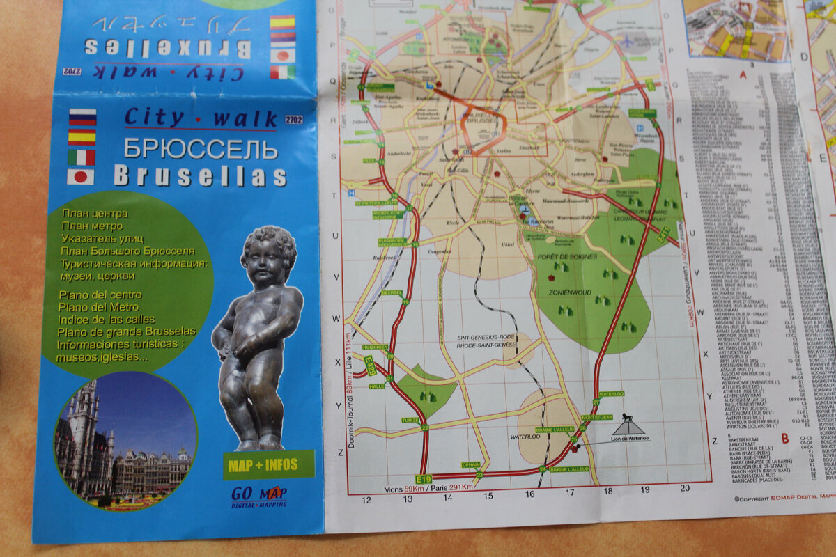 Налюбовались площадью, запечатлели себя на фото. Дождь (впервые за время путешествия) заставил нас купить зонтик и загнал в кафе. Перед едой купили карту Брюсселя на русском языке, чтоб найти знаменитую статую «Писающий мальчик». А как найти скульптуру, если роуминг за границей стоит целое состояние, а без связи остаться не хотелось. Телефон друга, который в роуминге не был, благополучно вырубился (села батарейка), и мы остались без навигатора. Думал поможет карта. И тут нарвались на мошенничество! Обложка карты на русском языке, больше ни слова на русском! Улыбнуло!