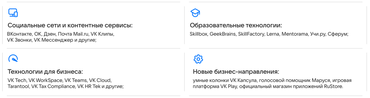 Ей принадлежит и Дзен, и почта Мейл.ру, и образовательные платформы Skillbox, GeekBrains, SkillFactory, и голосовой помощник Маруся, и сервис объявлений Юла, и даже недавно созданный официальный магазин приложений для Андроид RuStore. И много чего ещё, что долго перечислять.