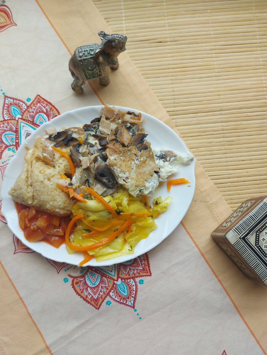 Вот уже практически половина пути, от намеченного пройдена. Только сейчас стала замечать, что мое пальто больше предательски не трещит по швам, особенно в области талии. Но в груди, объем не особо ушел. Печально. Одну неделю точно, не делала измерения, как-то совершенно забыла про них. Не уверена, что вообще буду делать это в ближайшее время. Скорее всего оставлю на конец второго месяца в качестве подведения итогов. Сейчас это точно не является главным для меня. Еще, из положительных изменений заметила, отдышка стала немного меньше. Будет здорово, когда я распрощаюсь с ней окончательно. Завтрак Эстетика отсутствует, но и готовить пришлось наспех, как и есть. На завтрак была отварная пшеничка, яичница с ветчиной из индейки и шампиньоны. В качестве дополнения и разнообразия вкусов добавила немного лечо и капусту по-корейски. Ужин Сегодняшний день без перекусов и вообще, делала что-то на скорую руку и ела как лошадь, стоя. Так уж сложились обстоятельства. Не самые стабильные и прост