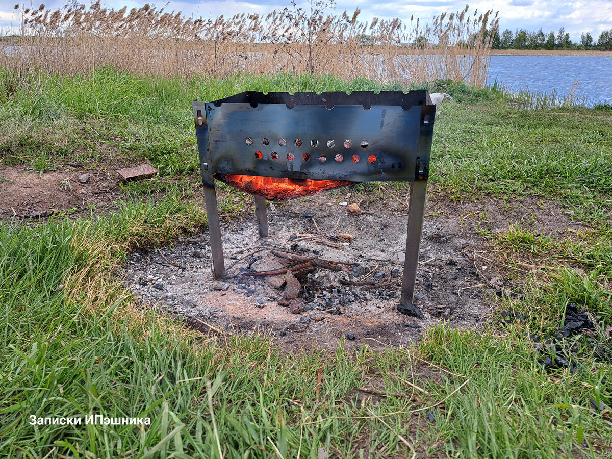 Пью кофе и смотрю на утку-поганку, интересно, где она вынырнет? Утки отлично ныряю и их на реке предостаточно. Вчерашний шашлык был выстраданным, иначе и не назовёшь. Муж намариновал 3 кг, выбрав в этот раз в качестве маринада обычный ускус, лук и перец. Сто лет не мариновали в уксусе, пробуя различные рецепты, благо их немало, а тут захотелось. Купил мангал одноразовый, причём у нас до этого был такой же, и он продержался года два, да и сейчас пылится в гараже, а тут решили открыть сезон с новым. ...Первым делом стало отваливаться дно. К раскаленному железу не притронуться, мы сидели и наблюдали, упадёт ли оно полностью или останется в таком положении? Упало Все угли оказались под мангалом и мы (с нами были Лена и Олег) стали искать кирпичи, чтобы хоть на них положить решетку с шашлыком. Олег выудил парочку из воды, но этого было недостаточно Пока мы искали кирпичи, Петя водрузил отвалившееся дно на место и обжигая пальцы собрал угли Жизнь заиграла красками, выход есть из любой с