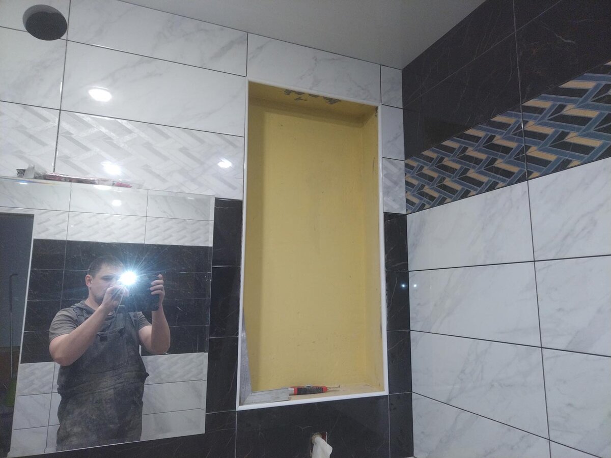 Сегодня немного решил откатить назад, благо не все темы предыдущего ремонта удалось осветить... Вернемся к работе с кафелем. Расскажу, как я полочки в нишу из плитки делал. Итак, передо мной стояла задача изготовить и смонтировать полочки вот в эту нишу. Предварительно я подогнал размеры ниши по ширине плитки. Вот тут я чуть подробнее об этом писал. На этих полочках я решил попробовать свои силы в заусовке. Предварительно я прикупил вот такую приблуду для запиливания кафеля на 45 град. Позднее, я думаю, про нее напишу отдельно. С ее помощью посрезал кромку плитки по длинному краю. Стараясь, чтобы диск не касался эмали, а шел чуть отступив от нее (примерно на 0,5 мм). Честно говоря, качество такого чернового реха оставляет ожидать лучшего, поэтому его я доработал "черепашкой" Затем я подрезал плитки по ширине с обратной стороны УШМ - ничего особенного, я этот шаг даже фотографировать не стал... (этот обрезок пошел на кромку - см ниже) А вот теперь самое интересное - вырезание передней к