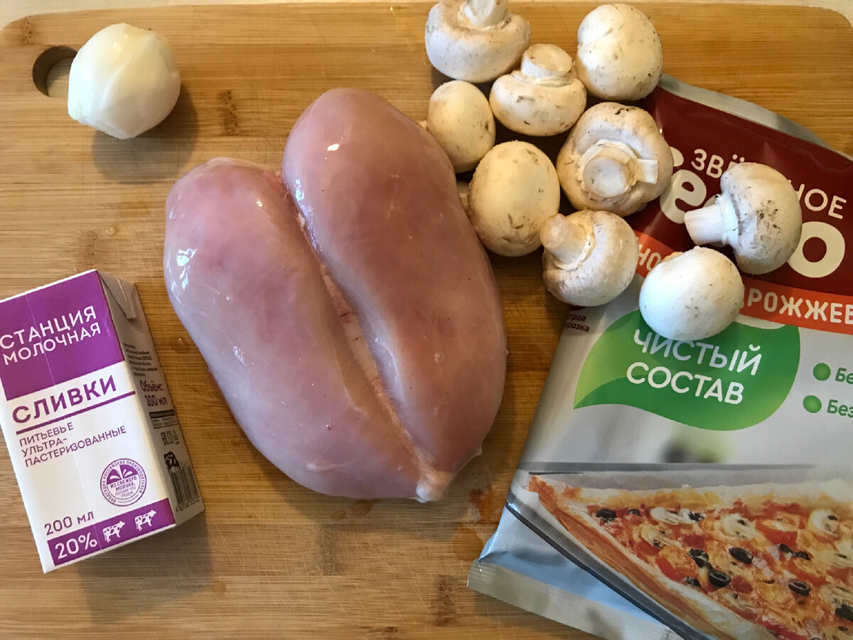 Добрый день. Сегодня готовим замечательный французский пирог. Состав : Куриная грудка … 1 шт. Сливки … 200 мл. Шампиньоны … 200 гр. Сыр … 100 гр. Тесто слоеное … 1 упаковка Яйцо … 2 шт. Лук … 1 шт. Лук порежем кубиками Грибы режем пластинами Грудку режем небольшими кусочками В сковороду наливаем подсолнечное масло и в нем растапливаем сливочное масло. Обжарим сначала лук. Потом лук убираем и отдельно обжарим грибы. Примерно минут семь. Грибы так же убираем и обжариваем курицу. Обжариваем сразу на большом огне, чтоб появилась корочка и сок запечатался внутри В отдельной ёмкости смешиваем курицу, лук и грибы Добавляем тёртый сыр и заливаем сливки Разбиваем два яйца , солим и перчим. Все перемешиваем Получаем вот такую массу Разогреваем духовку. Пока духовка нагревается займёмся тестом. Раскатываем немного один пласт под размер противня. Смазываем противень сливочным маслом. Выкладываем первый слой теста Потом сверху второй слой. Как на картинке Заливаем начинку Вс