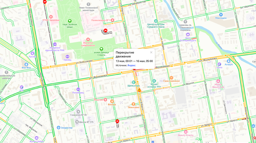 Из-за ремонта трамвайных путей по перекрестку улиц 8 Марта и Фурманова с 00:00 13 мая до 05:00 16 мая будет закрыто движение всех видов транспорта. Из-за этого схема движения части общественного транспорта изменится. Трамваи: Автобусы: Кроме того, на время ограничения движения изменятся некоторые остановки. На маршрутах №№ 50, 54, 57, 57а, 012, 014, 016, 019, 030, 047, 054, 056, 81, 083 остановочный пункт «Большакова» временно перенесут с улицы 8 Марта на улицу Большакова в направлении «Автовокзал». На маршруте № 76 введут остановочные пункт «Аэроагентство» по улице Большакова в направлении «СТЦ МЕГА». Также на маршруте отменены остановочные пункты «Большакова» по улице 8 Марта и «8 Марта» по улице Фурманова в направлении «СТЦ МЕГА». А остановку «Облсобес» перенесут с улицы Фурманова на улицу Большакова в направлении «Синие камни». На маршруте № 46 сделают остановку «Аэроагентство» по улице Большакова в направлении «ТЦ Лента». Остановки «Большакова» по улице 8 Марта и «8 Марта» по улиц