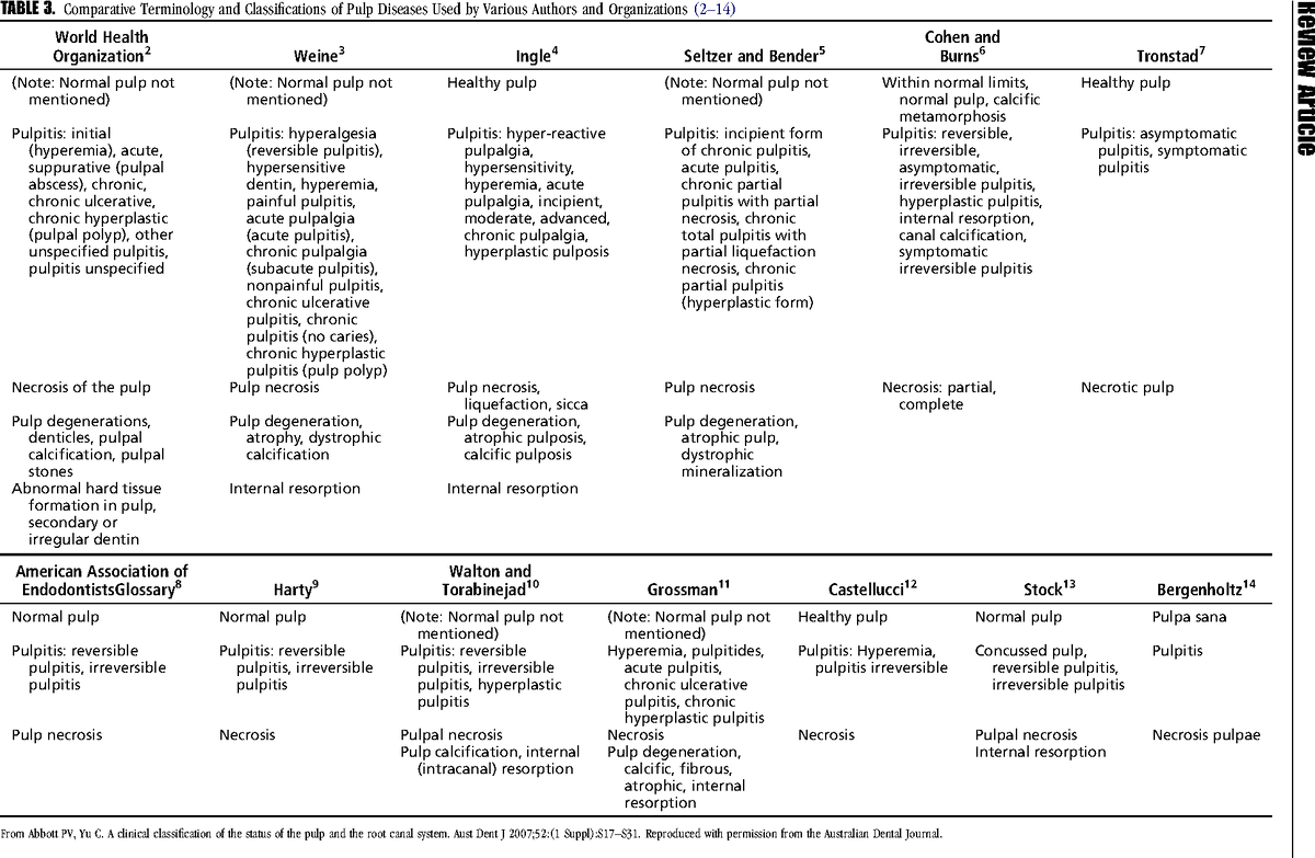 Рассматривая классификации, используемые в различных странах, диву даешься насколько они различны и противоречивы,а порой даже складывается впечатление,что мы живем на разных планетах. Например,в России и постсоветских странах все еще используются классификации пульпитов,в которых основной акцент ставится на серозное и гнойное воспаление,частичное и общее воспаление, острое и хроническое, а также обострившееся воспаление пульпы и т. д.[2]. Американские и европейские ученые используют классификации,которые представлены в Таблице, в которой уделяется внимание : гиперемии пульпы,обратимому и необратимому пульпиту,симптоматическому и бессимптомному пульпиту и т.д.