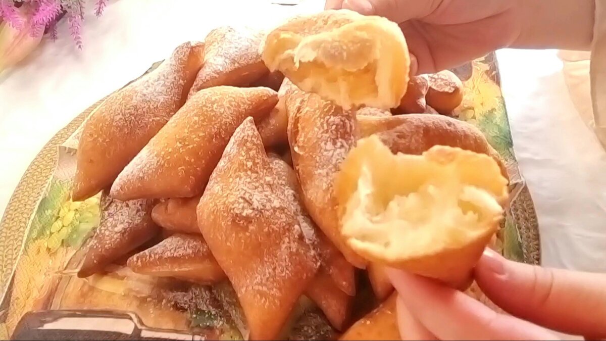 Рецепт приготовления и ингредиенты: 2 яйца. 2 столовые ложки сахара. Хорошо перемешать венчиком. 250 г сметаны 20%. Слегка перемешайте. 450 грамм муки. 1/3 чайной ложки соли. 10 г разрыхлителя. 20 г сливочного масла. Хорошо смешать. Посыпать стол мукой. Работаем с мукой. Вымешивайте тесто, пока оно не станет гладким. Раскатать тесто толщиной 1,5-2 см. Нарезать ножом для пиццы. Повторяйте за мной, это очень круто. Нагрейте больше растительного масла. Повторяй за мной. Обжаривать примерно по 1-2 минуты с каждой стороны до золотистого цвета. Посыпать сахарной пудрой. Посмотрите, какие они вкусные! Вкус отличный, и я уверен, что он понравится вам и вашим детям.👩🍳. Понравился этот рецепт? Поделитесь своим мнением в комментариях! Приятного аппетита!