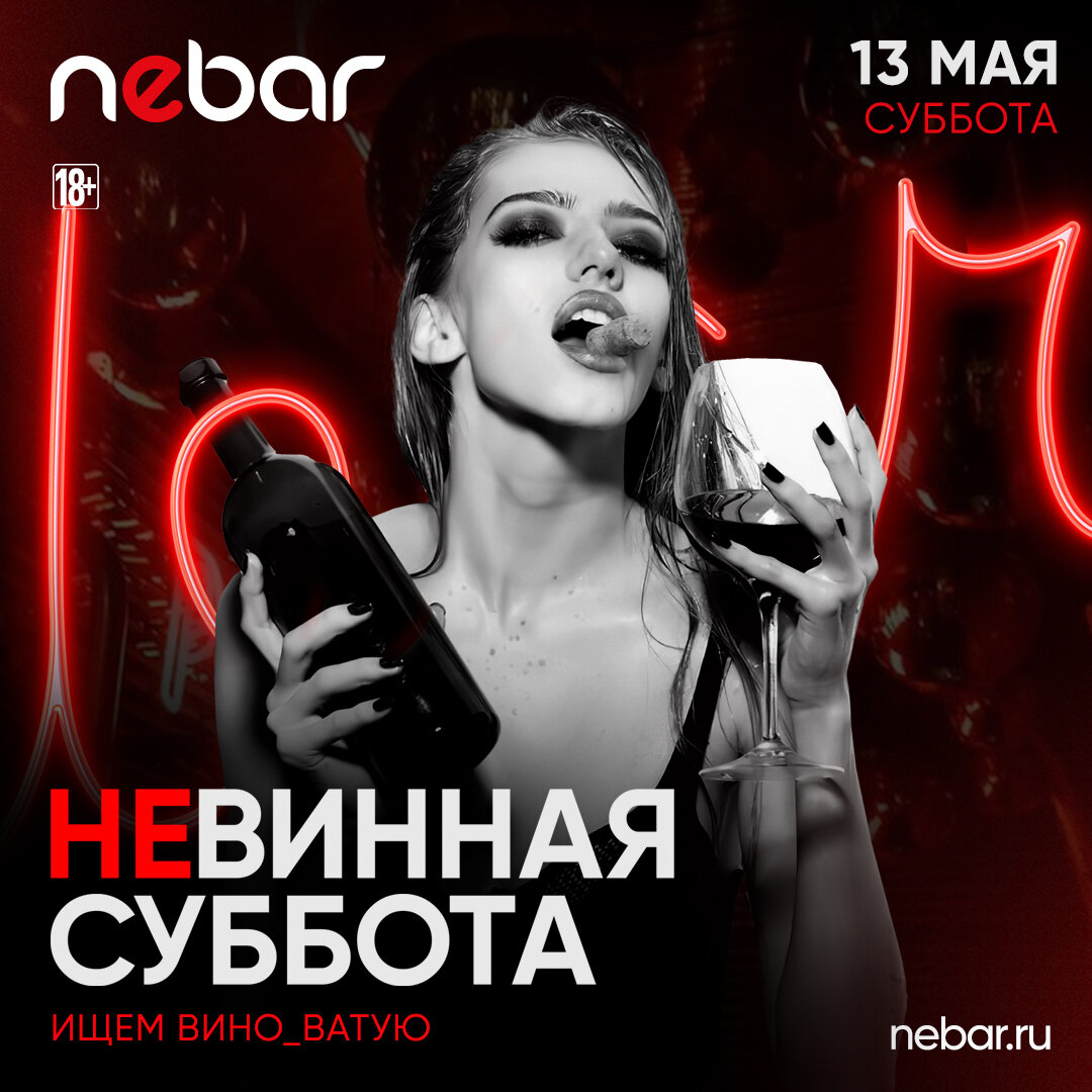 Представь: приглушенный свет, нежная атмосфера, вино и ты. Интригует? Тогда приглашаем на вечеринку «неВинная суббота» в Nebar. Этой ночью наши бармены будут следить за уровнем вина в твоем бокале и уровнем эндорфинов в твоей крови. Женщина, как хорошее вино в изящном сосуде, букет которого изыскан, но может выдохнуться, если вовремя не закупорить поцелуем. Каждой красотке на баре бокал вина за танцы на барной для повышения настроения. А самым ярким подругам отдадим бутылку вина. Мы позаботились о том, чтобы угодить каждой красотке и подготовили конкурсы для разных уровней. Для стеснительных малышек и тех, у кого это в первый раз: мы аккуратно положим тебя на барную, включим твои любимые треки, запишем сторис и будем пить белое сухое. Если хочешь что-то поинтереснее: забирайся на барную, демонстрируй свои лучшие движения и пей красное. Ну, а для настоящих зажигалок: снимай лишнюю одежду, пей боди-шоты текилы и запивай розовым вином. Выбирай свой уровень и полетели! Вспоминай, чему тебя