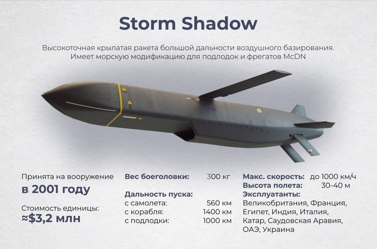 Крылатые ракеты Storm Shadow — широко известная высокоточная ракетная система воздушного базирования. Эти ракеты предназначены для нанесения дальних высокоточных ударов по различным наземным целям. Storm Shadow, разработанный европейским производителем ракет MBDA, является продуктом международного сотрудничества нескольких европейских стран. Ракета Storm Shadow оснащена турбореактивным двигателем и рядом передовых систем наведения. Она имеет дальность полета до 400 км и может нести полезную нагрузку до 450 кг. Эти впечатляющие возможности делают Storm Shadow эффективным оружием для поражения широкого круга целей, включая вражеские центры управления и контроля, системы ПВО и укрепленные цели, такие как бункеры и подземные сооружения. Одной из ключевых особенностей ракеты Storm Shadow является усовершенствованная инфракрасная ГСН, которая позволяет ей работать в любых погодных условиях. Ракета использует сложную систему наведения для навигации к цели, используя GPS и инерциальные навигац