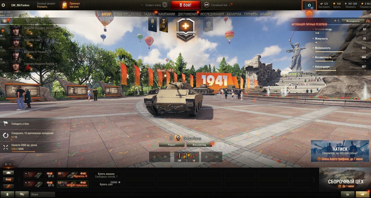 Привет всем сюда заглянувшим! Продолжаем прокачку твинка и выполняем обучение в Мире Танков. Давно не заходил, а тут столько всего. Новый ангар для 9 Мая, красота! Натиск - но в него мне пока рано. Сборочный цех на огнеметный танк, и конечно же выполняем далее обучение. Задача 6 выполнена, как и остальная часть обучение. Кстати, а игроков на этом уровне вполне достаточно. Но не обошлось и без "ложки дегтя", союзник столкнул меня с горы (он посинел, а это значит, что автоматическая система работает) на карте Малиновка, то ли он так старался врагов уничтожить, что меня не заметил, то ли преследовал другие цели. По задача пришлось попасть и режим - Топография, там прикольно, советую сходить и посмотреть. И задача, принесла хорошо серебра - 100 000 И тут еще есть задачи интересные. Выполнил оставшиеся задачи 7, 8, 9-ю по обучение, и пошел отдыхать. Всем хорошего настроения, и хороших боёв!