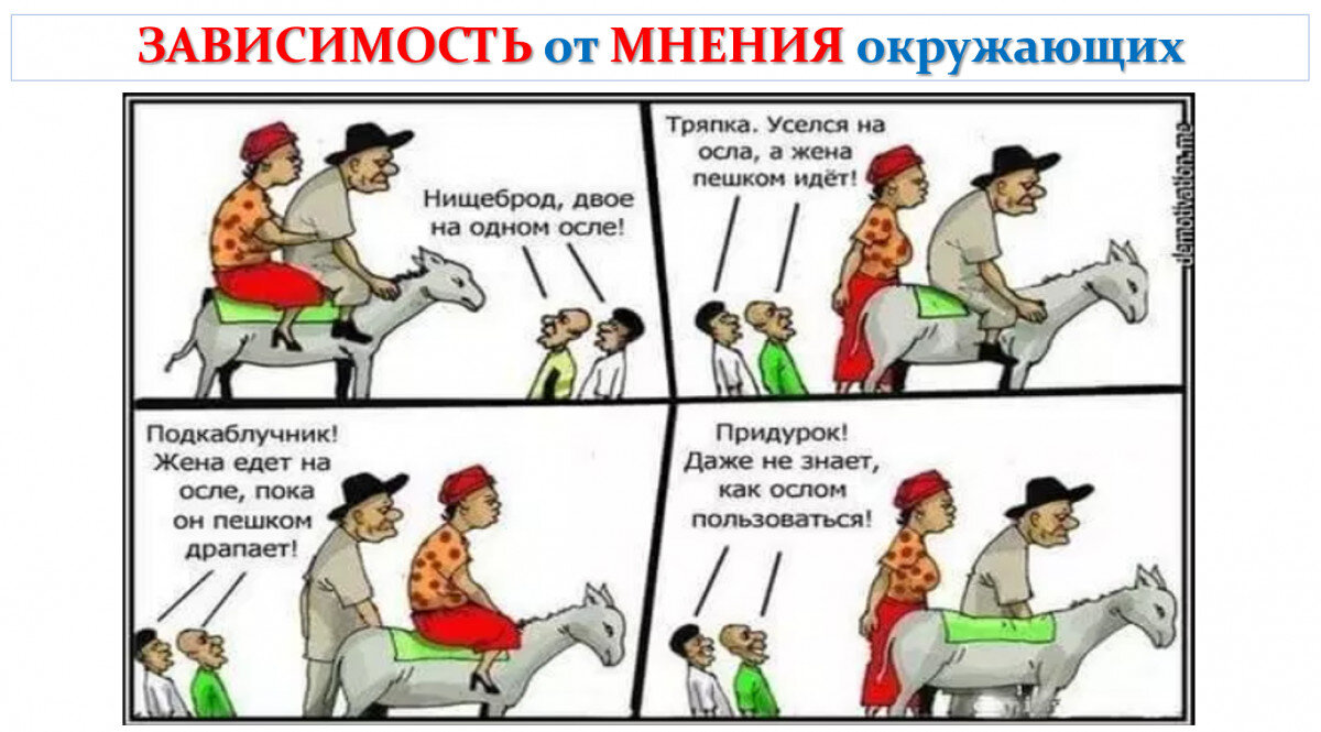 Зависимость от мнения окружающих, как ни банально, формируется в раннем детстве. Одна из клиенток вспомнила, как в возрасте 4 года, «она чуть не провалилась сквозь землю», когда мама отшлёпала её за то, что она, будучи в гостях, расплела косички. В это время, в другой комнате, гости громко смеялись - ей было очень стыдно, т.к. она думала, что смеются над ней. С тех пор у неё сформировался страх ходить в гости, в настоящее время, уже будучи женщиной с достаточно высоким положением, она «через силу» ходит на «светские мероприятия», свадьбы и корпоративы. У другой клиентки воспоминания: как в 5 лет мама «тащила» её в садик, упираясь она упала и «ободрала» коленки. Мама вместо того, чтобы пожалеть дочку и спросить «больно ли ей» – начала на неё «орать», девочка озиралась вокруг «вдруг кто-нибудь увидит?». Когда пришли в садик ей было стыдно перед воспитательницей и страшно, что мама начнёт жаловаться на неё. Мама, пожаловалась, рассказала, как дочь «упиралась» и поэтому «шмякнулась» т.к. е
