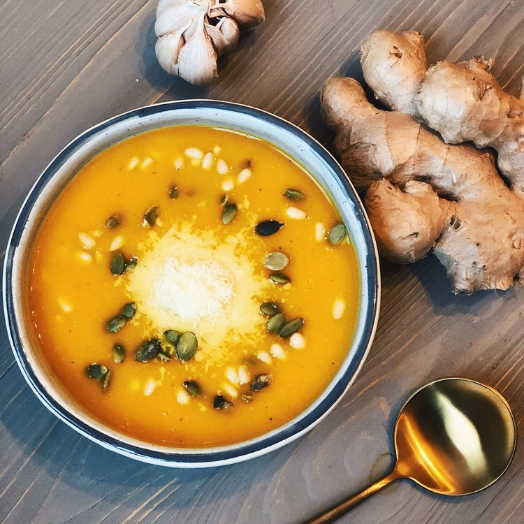 Добавить кокосовое молоко , зелень и прогреть, не доводя до кипения. В тарелку можно добавить кедровые орехи, семена тыквы.Приятного аппетита !