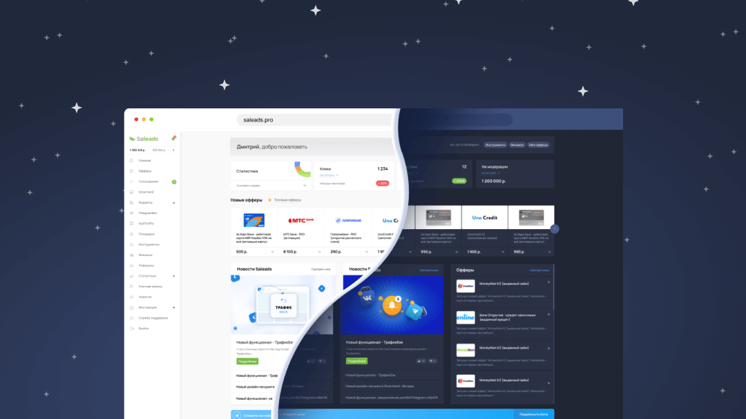 Теперь у вас есть возможность переключаться между светлой и тёмной темой в личном кабинете Салидс! По многочисленным просьбам вебмастеров в разделе Голосование мы создали дизайн личного кабинета тёмным, при этом вы в любой момент можете переключаться между светлой и тёмной темой. Активировать тёмную тему можно в левом верхнем углу личного кабинета Saleads.Pro: Включать тёмный режим можно в случаях недостаточного освещения, а также незадолго до сна. Мы заботимся о вас! Если у вас есть предложение по улучшению сервиса, мы готовы рассмотреть его в разделе Голосование. В этом разделе вебмастера оставляют свои идеи – за лучшие из них можно проголосовать; по результатам голосования эти идеи будут внедрены в интерфейс и функционал нашей партнерки. Ваш Saleads.pro