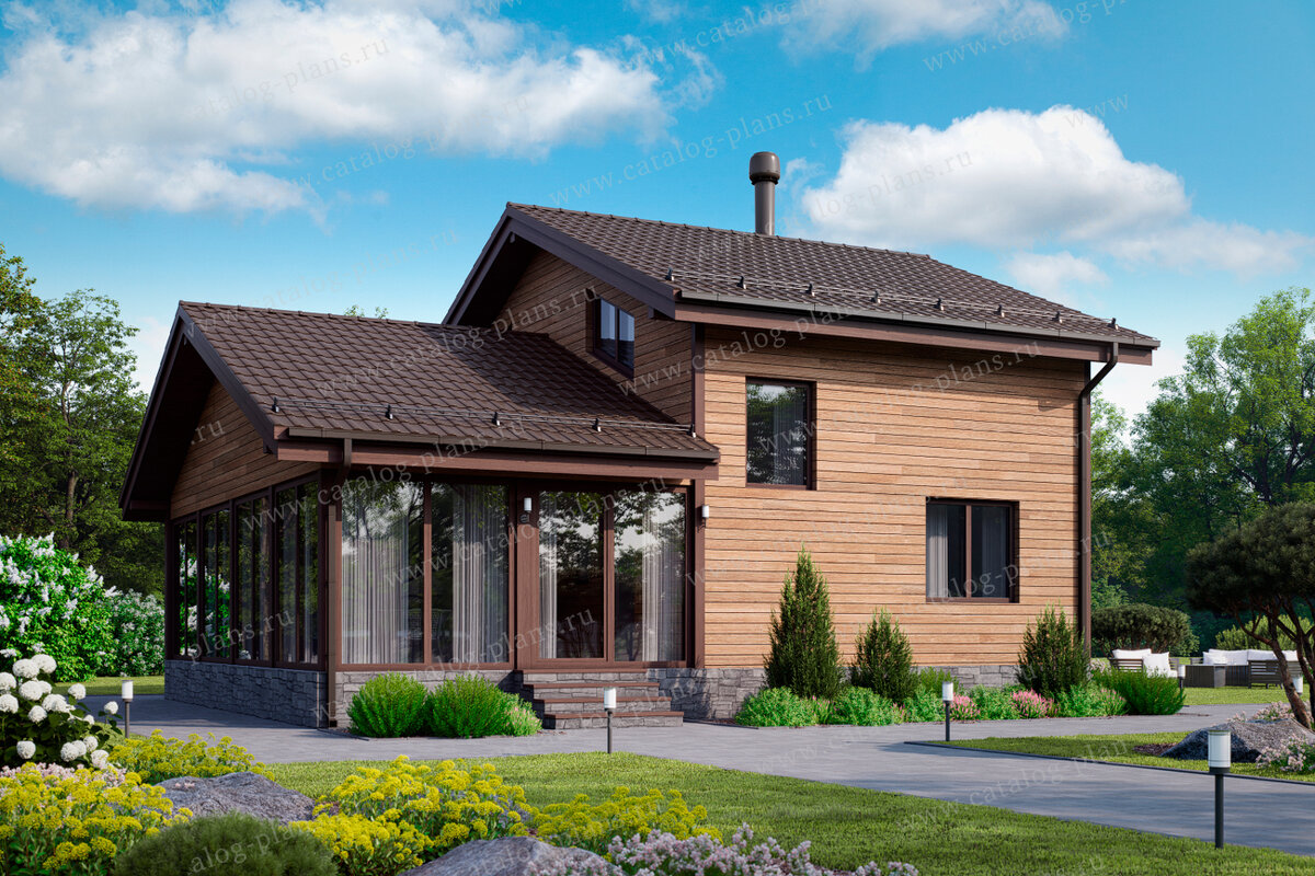 Общая площадь: 86 м² Террасы, балконы: 39,16 м² Габариты: 10.5x9 м Высота конька: 6.37 м Наружные стены: брус 150 Фундамент: винтовые сваи Перекрытия: по деревянным балкам Крыша: мансардная Кровля: металлочерепица Наружная отделка: сайдинг, искусственный камень Цоколь: нет Архитектурный стиль: русская усадьба Подробнее о проекте: