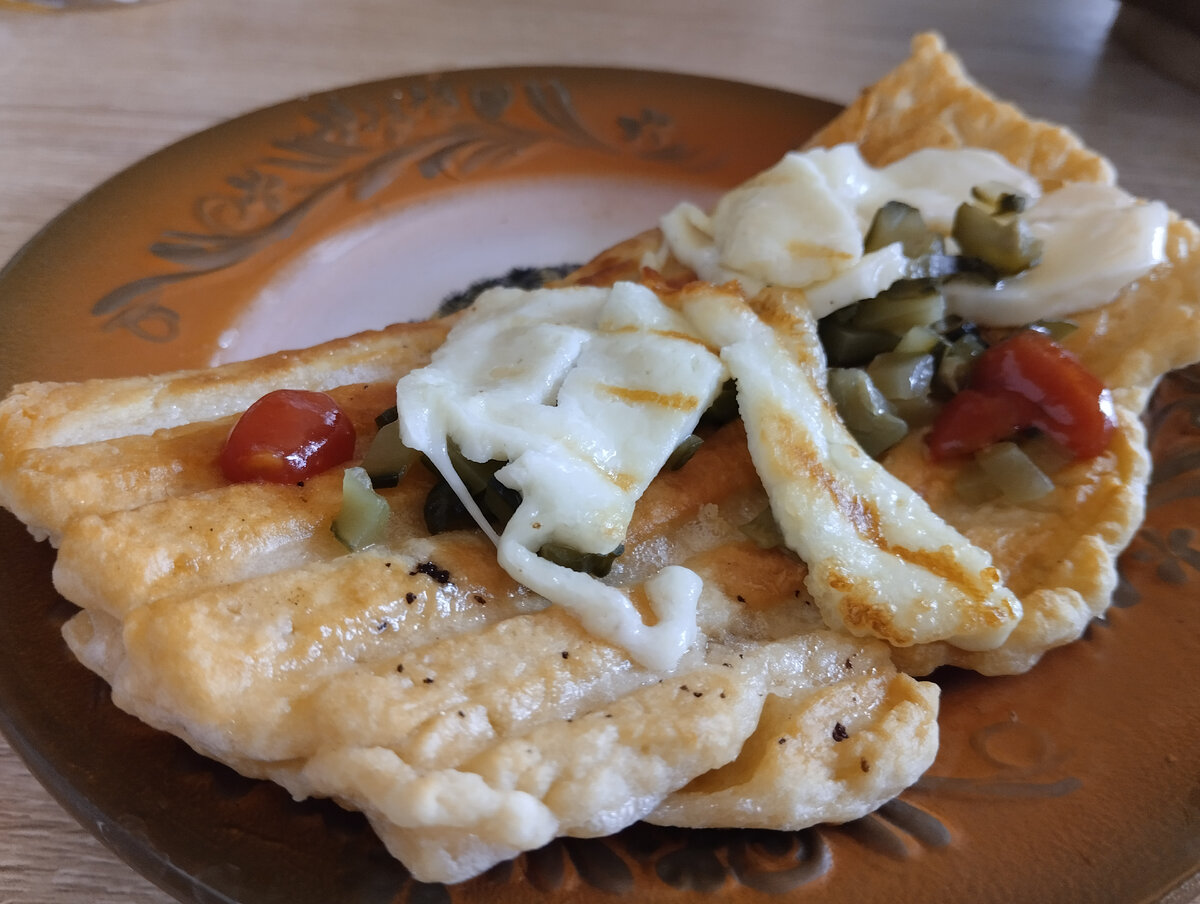 На лепёшку добавила мелко покрошенный солёный огурец, несколько капель кетчупа. Выложила на неë сыр. Хотела добавить ещё отварной курицы, но забыла. И так было вкусно.