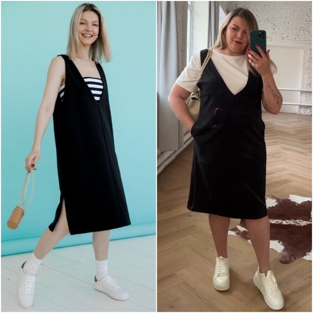 Такой сарафан - идеальное вложение в гардероб, особенно, если вы работаете в офисе. Он станет основой, а далее можно импровизировать, надевая под низ футболки, блузки, лонгсливы, рубашки, водолазки. Также этот сарафан можно носить обеими сторонами: V-образным вырезом и вырезом-лодочкой. Есть два варианта этого платья: мини и миди. Второе, конечно, более универсальное. Самое платье свободного фасона, следовательно, может скрыть наши с вами проблемные места. Я себе взяла размер XXL.