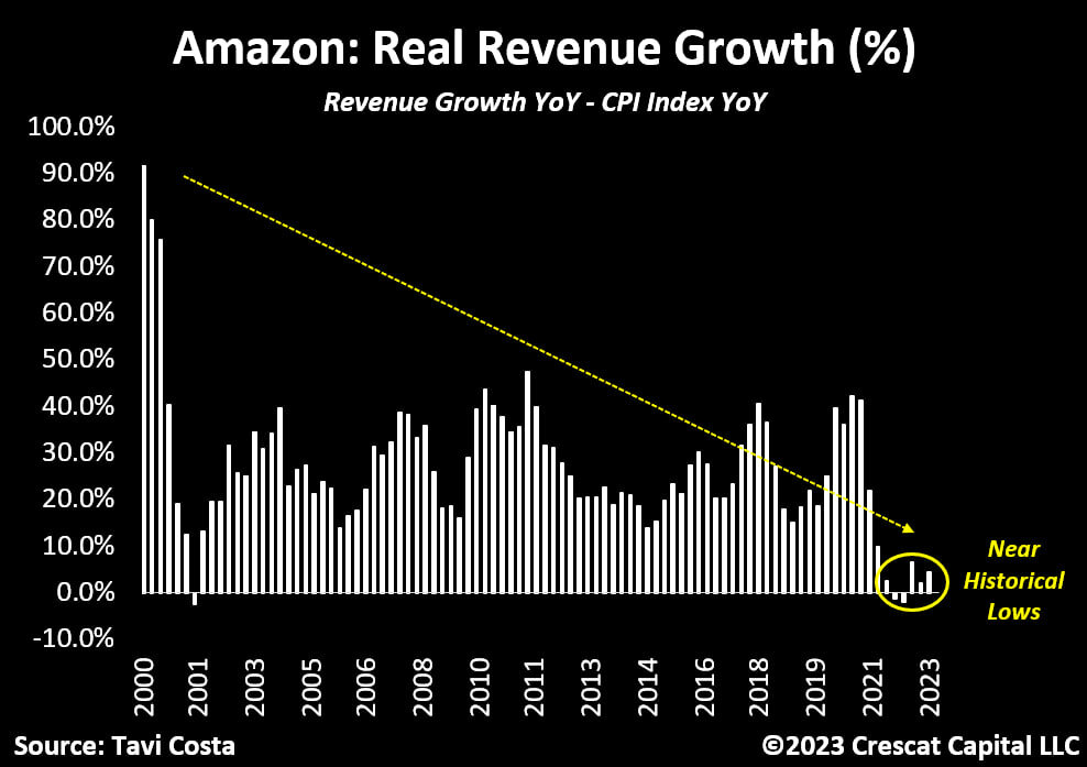 Прибыль Amazon только что рухнула примерно на 50% в годовом исчислении, и акции по-прежнему торгуются с прибылью в 115 раз, практически без роста выручки в реальном выражении.
