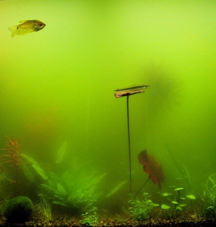 Вода быстро мутнеет и зеленеет, появляются неприглядные обрастания водорослями стекол, декораций и даже самих растений.