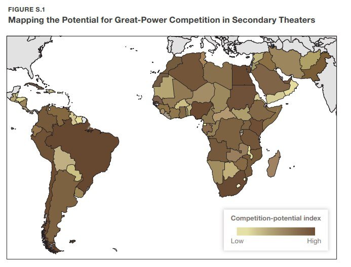 Раньше у США было всего два театра геополитических действий: на Тихом океане (против Китая) и в Старом Свете (против России), но уже в скором времени стоит ожидать нарастания противостояния и его эволюции — с разрастанием конфликтов по всему Земному шару. Об этом говорится в докладе RAND Corporation "Конкуренция и конфликт великих держав в XXI веке за пределами Индо-Тихоокеанского региона и Европы". ▪ Влияние Пекина и Москвы на второстепенных театрах военных действий усиливается, считает RAND. И публикует несколько схем. Стоит отметить, что обозначение ряда стран как областей с низким потенциалом конфликта вовсе не означает, что данные регионы не интересны Вашингтону. Просто, например, в Иране Соединённым Штатам мало что светит, так что не стоит и пытаться. ▪ Конфликты будут многогранными и не обусловленными "нулевой суммой", как в Холодную войну, отмечает аналитический центр. Не исключены и прямые военные столкновения США с КНР и Россией — однако всё большую роль будут играть не мас