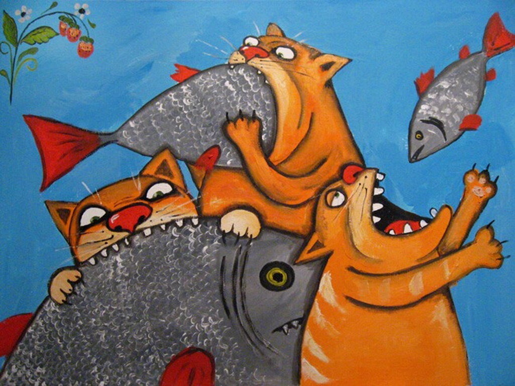 Российский художник Алексей Владимирович Куделин, известный широкой публике под именем Вася Ложкин, не нуждается в представлении. Выставки Васи Ложкина проходили в различных городах России и Европы, а герои картин часто мелькали на телевидении и в интернете в виде анимации и музыкальных клипов. Вася рисует разных героев, но сегодняшняя публикация посвящена котам, которых рисует Вася. Коты Васи принимают разные облики и пребывают в разном настроении. От веселых и беззаботных... До трудолюбивых и старательных. А ещё Вася часто рисует котов-обжор. Или котов-хулиганов. Есть даже коты-гангстеры. И коты с совершенно разным восприятием одного и того же. А есть коты, играющие в кораблики. Иногда коты могут прийти в гости. А иногда угрюмо прогуливаться по улицам под дождём. А ещё коты очень любят сидеть на деревьях. Танцевать и петь песни тоже любят. Но для всего этого требуется энергия, а для энергии нужно подкрепляться колбасой. Коты-пионеры. Коты-геймеры. И коты, которые обожают к