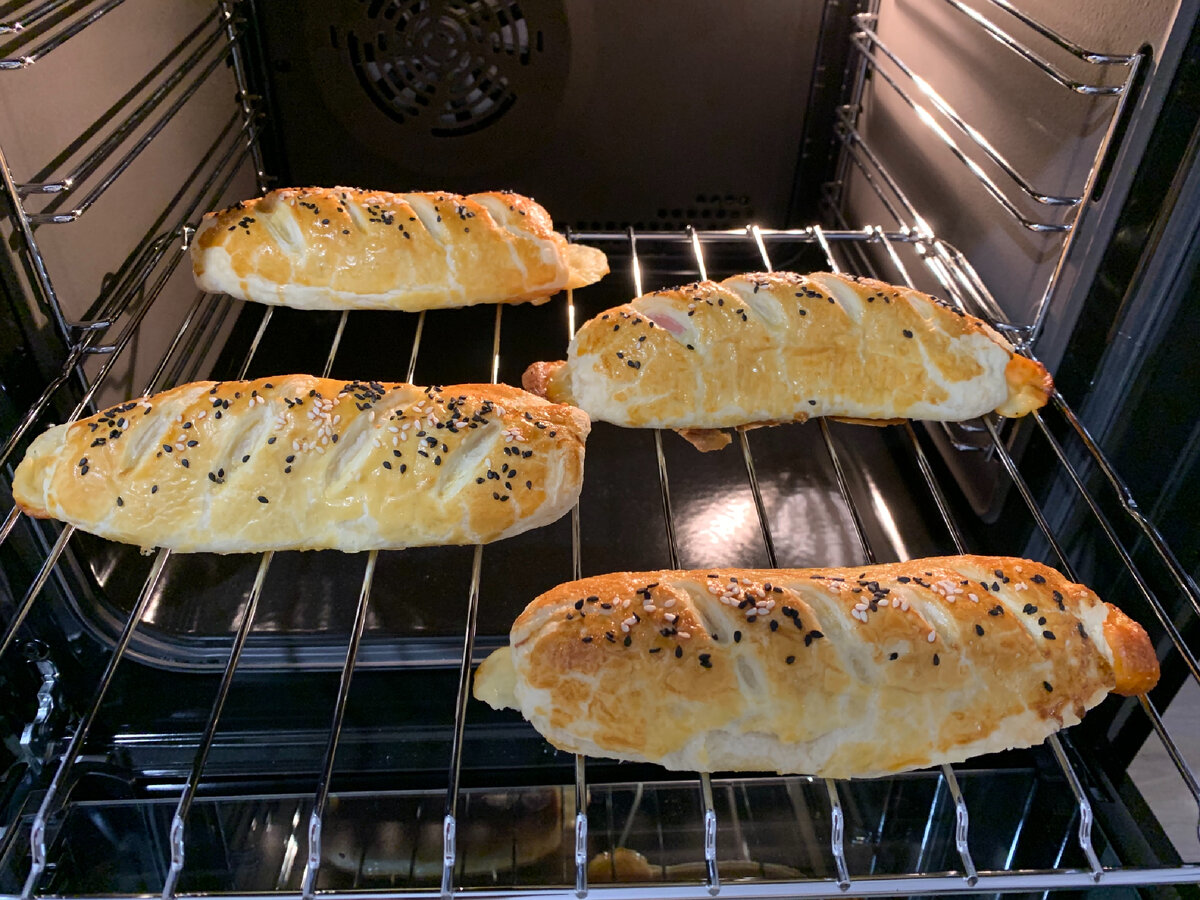 Сосиска в тесте - всеми любимый перекус. В Германии это блюдо известно под названием Würstchen im Schlafrock — «сосиска в ночной рубашке». Делается быстро и съедается так же 😀 Ингредиенты: Предварительного размораживаем тесто. Включаем разогреваться духовку на 170 градусов. Удобно брать тесто в пластинах - 400 гр это две пластины, каждую разрезам на пополам и раскатываем. В центр теста кладём соску и заворачиваем в ‘рубашку’. Разрезаем верхний слой теста. Яйцо взбиваем вилкой и намазываем булочки, посыпаем кунжутом. Выкладываем на застеленный пергаментом противень. 25 минут и готово!
