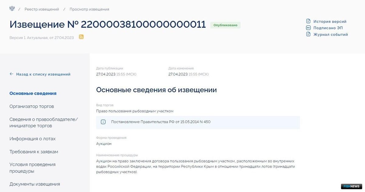 Заявки на аукцион (https://torgi.gov.ru/new/public/notices/view/22000038100000000011) принимаются до 30 мая, торги планируется провести 6 июня, сообщает корреспондент Fishnews. Аквафермерам предлагают 13 рыбоводных участков, расположенных в Симферопольском, Бахчисарайском, Красноперекопском и Сакском районах. Площадь РВУ — от 0,2 до 18,3 га. Начальные цены варьируются от 202 рублей до 14,6 тыс. рублей.