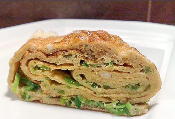 Как только яичный блинчик слегка схватится, посыпать его мелко нарезанным луком пореем.