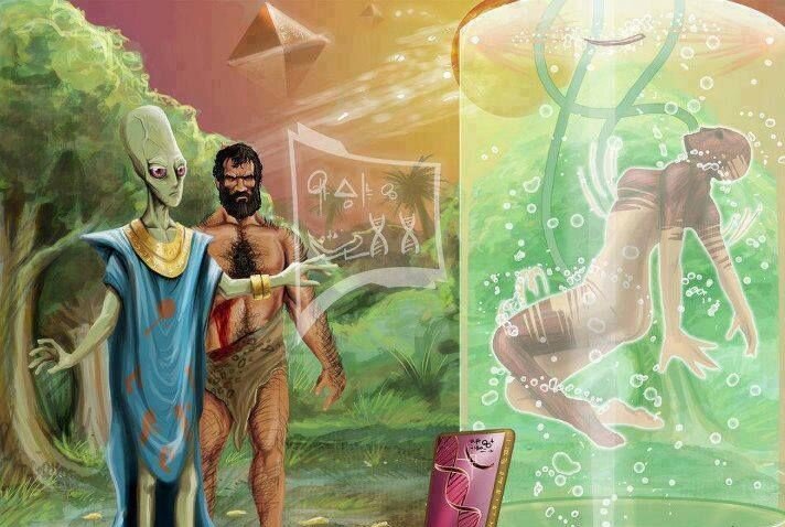 На египетских, да и не только египетских, фресках вообще есть много такого, с чем человечество познакомилось лишь в последние века и даже десятилетия: электрические батареи, телевидение, компьютер, космические аппараты, летательные аппараты для перемещения в слоях земной атмосферы и прочее в таком же духе. Если цивилизация "богов" египтян знала все это, то до опытов с человеческим геномом - просто рукой подать.