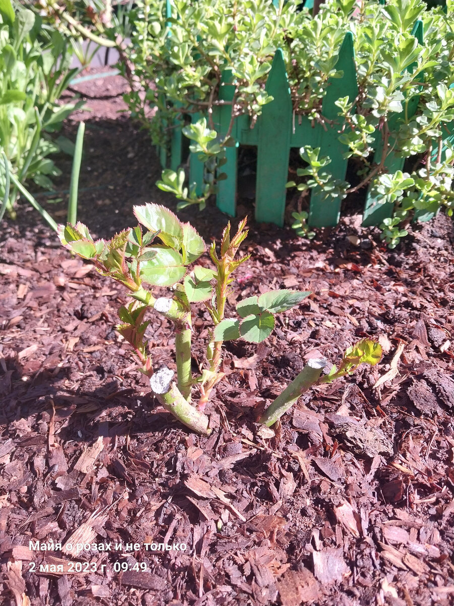 Розы из Подворья были получены с разницей примерно в 10 дней и высажены сразу в грунт в начале и середине апреля. В посадочную яму добавляла суперфосфат и горсть золы. Розы после посадки никогда и ничем не прикрываю, слегка окучиваю землёй или конской подстилкой. После того, как верхние почки пошли в рост, землю разравниваю.