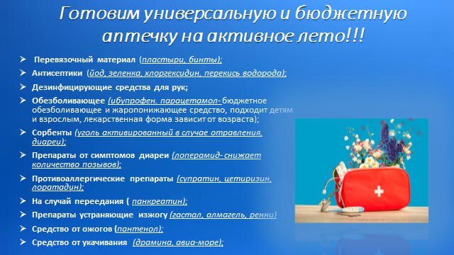 🤕Перевязочный материал (пластыри, бинты); 🦠Антисептики (йод, зеленка, хлоргексидин, перекись водорода); 🦠Дезинфицирующие средства для рук 💆♀️Обезболивающее (ибупрофен. парацетамол- бюджетное обезболивающее и жаропонижающее средство, подходит детям и взрослым, лекарственная форма зависит от возраста); 🪸Сорбенты (уголь активированный в случае отравления, диареи); 🦨Препараты от симптомов диареи (лоперамид- снижает количество позывов); 🫠Противоаллергические препараты (супратин, цетиризин, лоратадин); 🫄На случай переедания ( панкреатин); 🙊Препараты устраняющие изжогу (гастал, алмагель, ренни, 😭Средство от ожогов (пантенол); 🤢Средство от укачивания (драмина, авиа-море);
