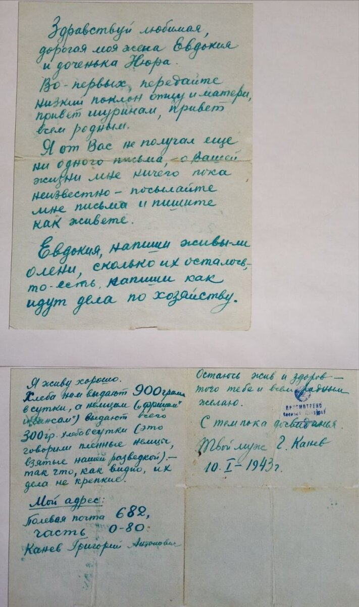 Фронтовые письма хранятся в фондах многих музеев на Ямале. Бережно хранят их и в Приуральском районе. Пять писем в краеведческом музее Аксарки и три – в школьном музее Белоярска. Много ямальцев ушло на фронт бить врага. В тяжелейших условиях войны они не забывали родной дом – после каждого привала, короткой передышки между боями на Север летели фронтовые треугольники. В своих письмах они не рассказывали о битвах, ранениях, невзгодах, пытались, в первую очередь, успокоить родных тем, что живы-здоровы и передавали приветы всем родственникам. И конечно же, спрашивали о том, что их волновало. Так, например, приуральца Максима Васильевича Попова интересовали уловы рыбы на Оби, а Григория Антоновича Канева занимал вопрос, сколько оленей осталось в его хозяйстве. Фотографии этих писем мы приложили к посту. Одно из писем – с расшифровкой без правок. Расшифровка письма. Добрый день, здравствуйте, высылаю моей жене Августе Матвеевне, от мужа вашего Максима Васильевича. Шлю я вам сердечный привет