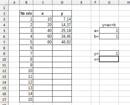 Если из полученного уравнения линии переписать значения коэффициентов a и b в ячейки “G5” и “G6” соответственно, то при указании в ячейке “G9” значения измеренного у исследуемого образца аналитического сигнала, формула в ячейке “G10” посчитает концентрацию.