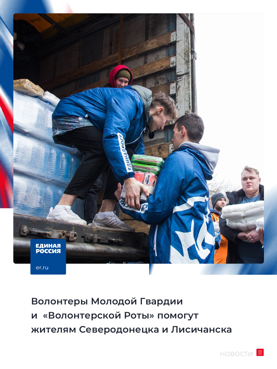 На Донбасс отправился очередной, 35-й волонтерский отряд Молодой Гвардии Единой России и «Волонтерской Роты». Добровольцы будут помогать в восстановлении мирной жизни жителям Северодонецка и Лисичанска. Также они проведут там мероприятия, посвященные Дню Победы. Сейчас на Донбассе волонтеры партии: