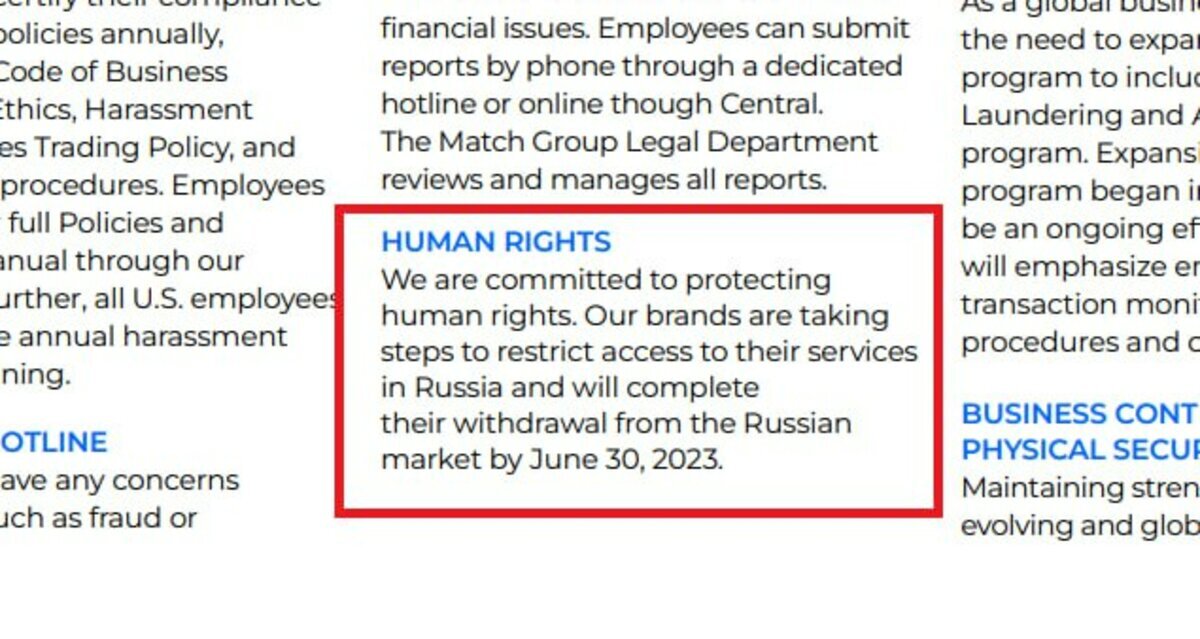 Бренд предпринимает шаги для ограничения России к своим услугам. В компании заявили, что бренды Match Group, которой принадлежит Tinder, «предпринимают шаги по ограничению доступа к своим услугам в России». Попрощаться с российским рынком компания планирует к 30 июня 2023 года, сообщили представители в ежедневном отчете организации. «Наши бренды предпринимают шаги для ограничения доступа к своим услугам в России и завершат свой уход с российского рынка к 30 июня 2023 года», – говорится в ежегодном отчете компании. Платформа для онлайн-знакомств Tinder работает через мобильные приложения для смартфонов. Match Group, помимо Tinder, также владеет сервисами Match.com, Meetic, OkCupid, PlentyOfFish, Ship и OurTime. Ранее Readovka писала о том, что Microsoft хочет остаться на российском рынке.